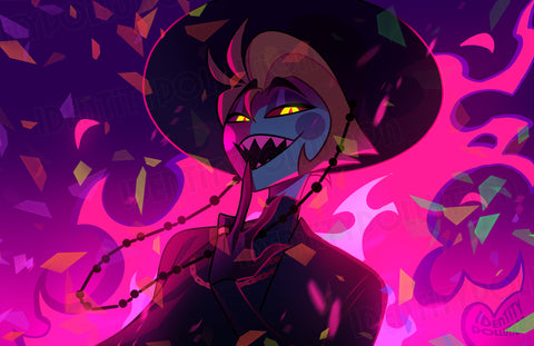 Fan made, high quality, professional prints of Alastor and Lucifer as Jinu and Baby from K-pop Demon Hunters on heavyweight holographic shatter-effect cardstock!